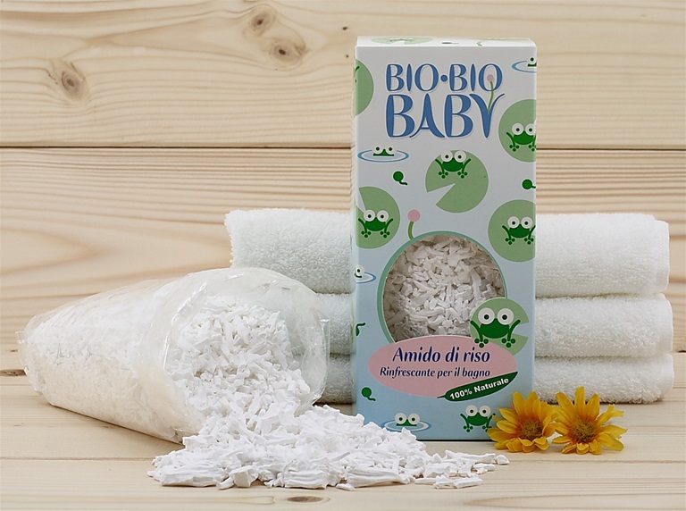 Verter 4 cucharadas colmadas de Almidón de Arroz en una bañera pequeña con agua, o 7 cucharadas, en una bañera normal, remover con la mano hasta que el almidón se disuelva por completo y proceder con el baño del bebé, masajeándolo suavemente.