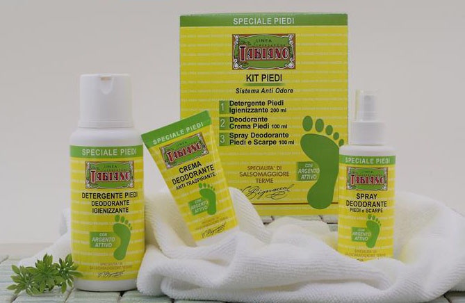 Spray desodorante para pies y calzado: Alcohol denat., Aqua [Water], Parfum [Fragrance], Phenoxyethanol, Colloidal silver, PEG-40 hydrogenated castor oil, PEG-40 castor oil, Polysorbate 20, Sodium dehydroacetate, Triclosan, Ethylhexylglycerin, Mentha arvensis leaf oil, Linalool, Hexyl cinnamal, Limonene, Polysorbate 80, Benzyl salicylate, Citronellol, Glycerin, Butylphenyl methylpropional, Geraniol, Citral, Benzyl benzoate, d-Limonene, Coumarin, Sulfur